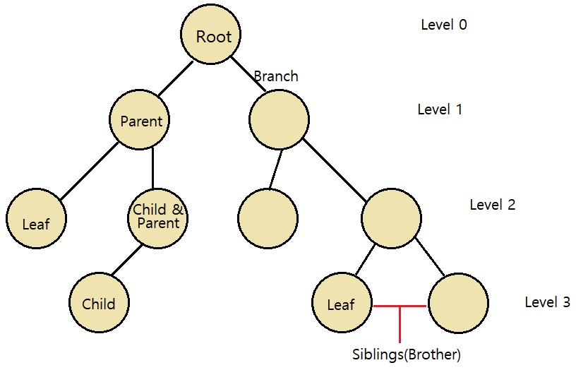 - Level : 루트노드를 0으로 하여 야래쪽의 노드 중 가지를 쳐서 연결된 노드들의 깊이